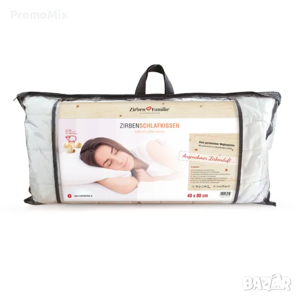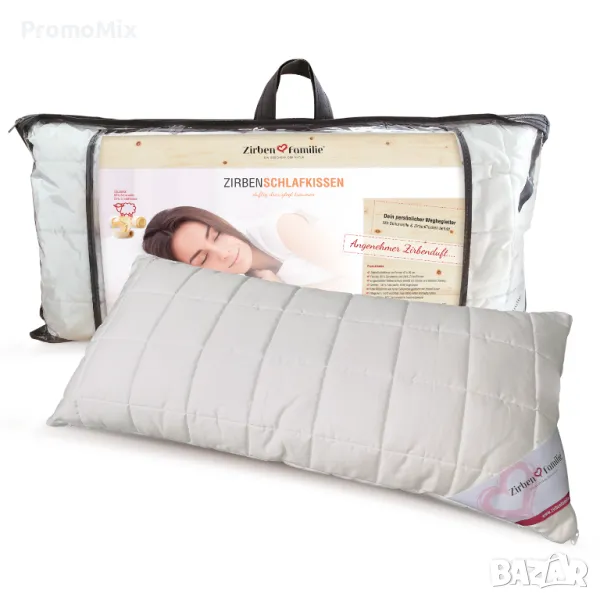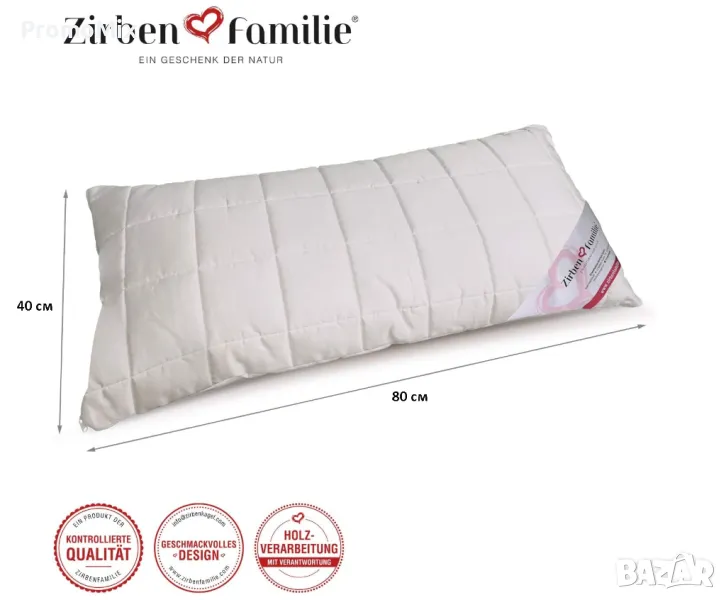 Zirben Familie 1290 е възглавница с размери 40 х 80 сантиметра, изработена с калъфка от 100% сатениран памук.