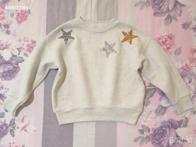 На 6 снимка ватирана блуза със звезди от мъниста ZARA kids. По етикет е за 6г р.116, дължина 42см, широчина 41см, дължина на ръкава от вратната извивка 46см. Цена 10лв.