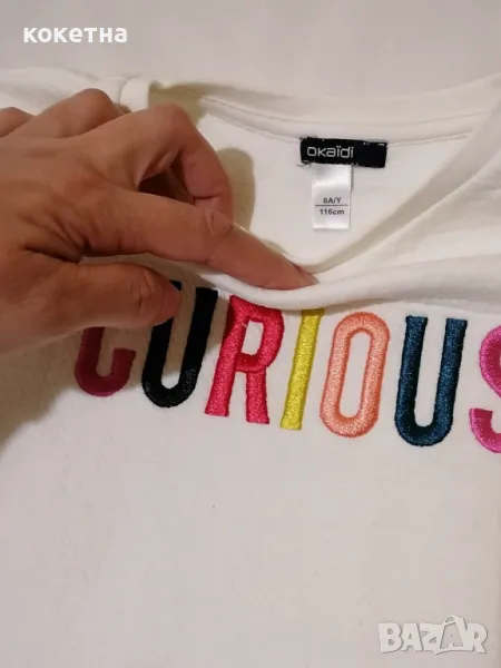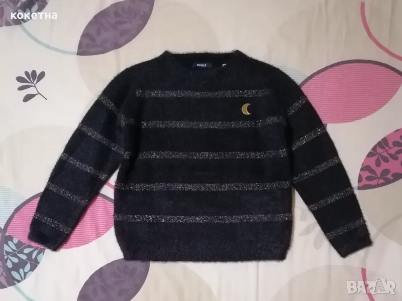 На 1 и 2 снимка пуловер OKAIDI по етикет за 6г р.116. Дължина 43см, широчина 39см, дължина на ръкава от вратната извивка 49см. Цена 10лв.