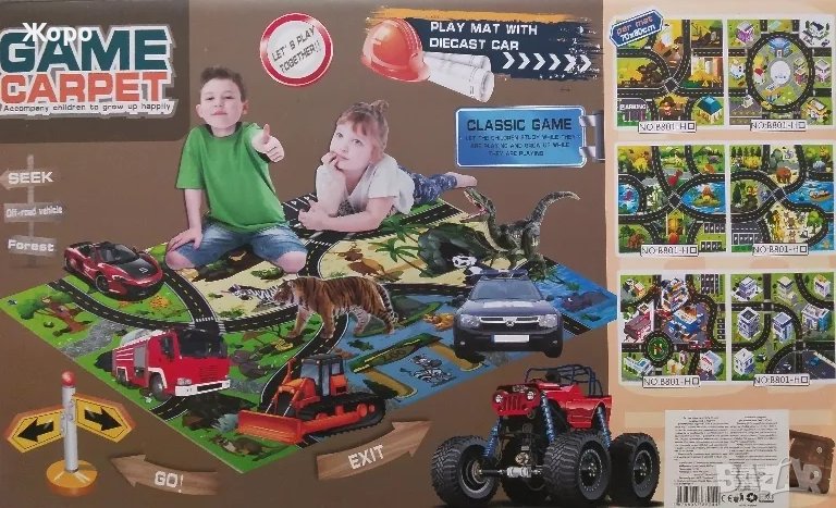 Комплектът съдържа цветен килим с пътеки ,които помагат децата в ориентацията и развитието на координацията ,5 бройки различни полицейски превозни средства и пътни значи