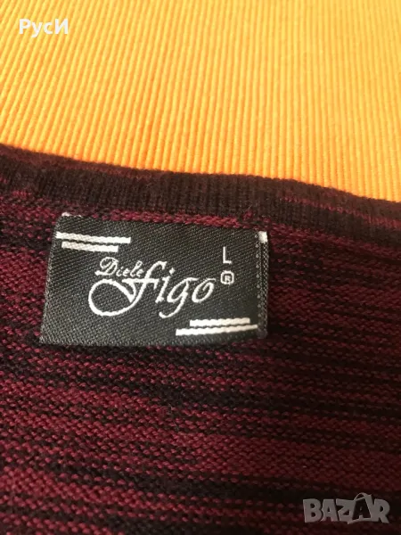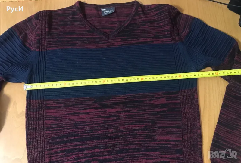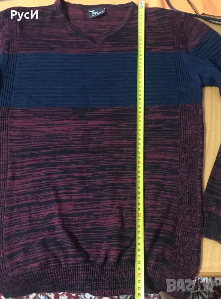 Фин мъжки пуловер с контрастна релефна плетка На гръдна височина- тъмно синя ивица, останалата част е в цвят бордо. Състав 50% памук, 50% акрил, Отговаря на размер М