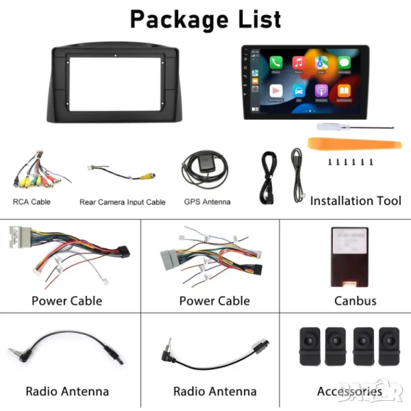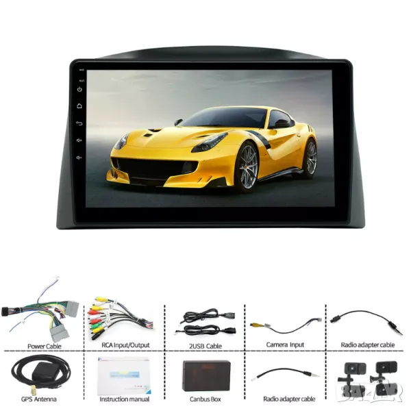 Пълен комплект с цялата рамка, преходни кабели и букси, декодери, предназначени и съвместими за монтиране на конкретния модел автомобил.
