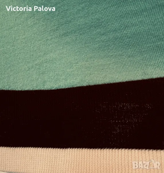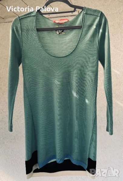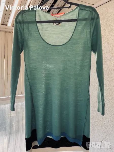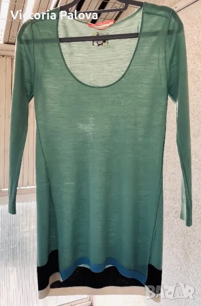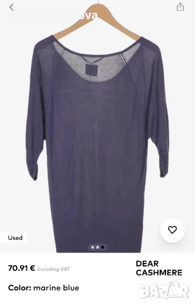 Интересна блуза като модел, и като цвят, и като изработка - ултратънка, почти прозрачна, много приятна на допир, неизползвана. Рамо - 42-44см, ГО - 42-44см, дължина отпред - 71см, отзад - 78см, ръкав - 54см.
