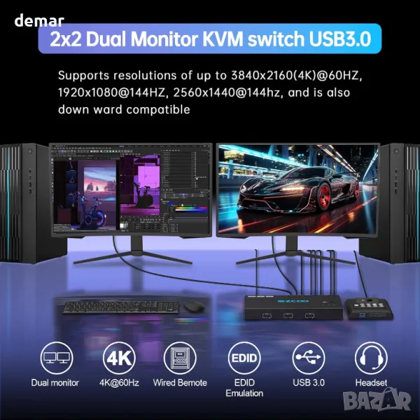4K@60Hz HDMI KVM превключвател, 2 монитора-2 компютъра, EDID,4 USB 3.0