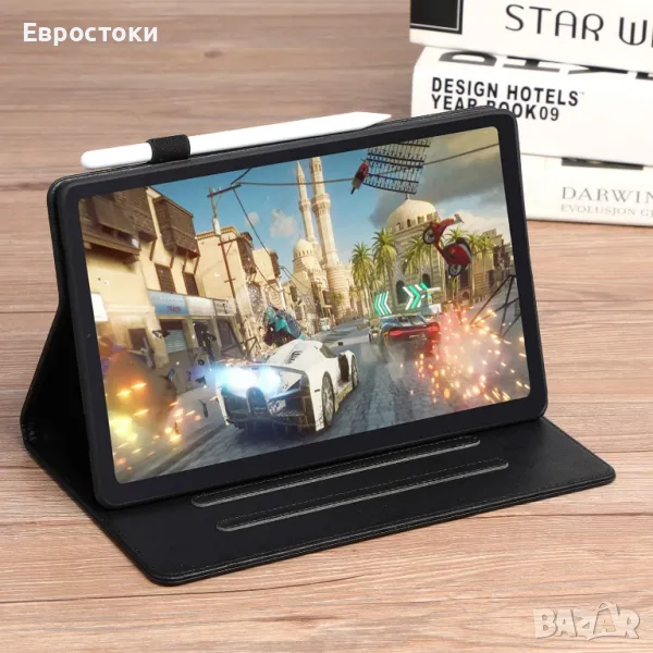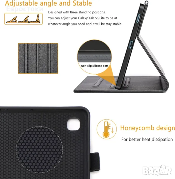 Регулируеми ъгли на стойката: Стойката може да се регулира на 3 фиксирани ъгъла, можете да регулирате ъгъла, за да поддържате вашия Samsung Galaxy Tab под идеален ъгъл за удобно гледане, писане или рисуване. Има точки против плъзгане от двете страни на долния корпус, за да поддържа стойката стабилна