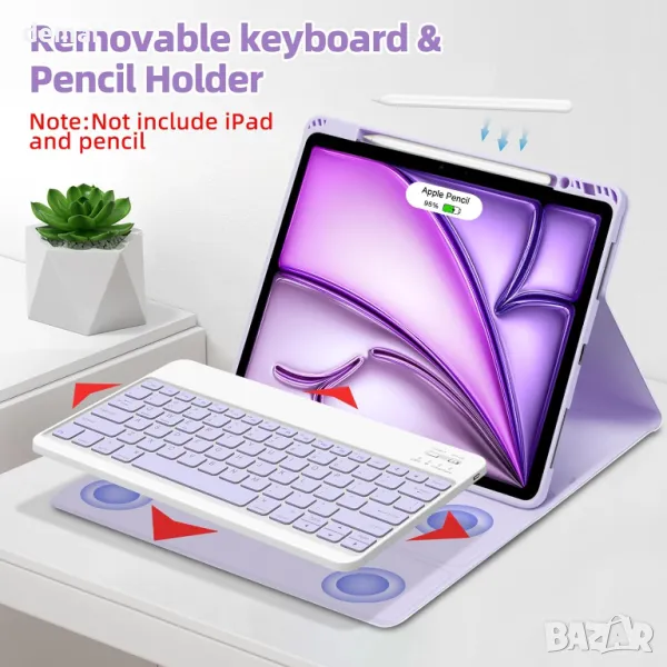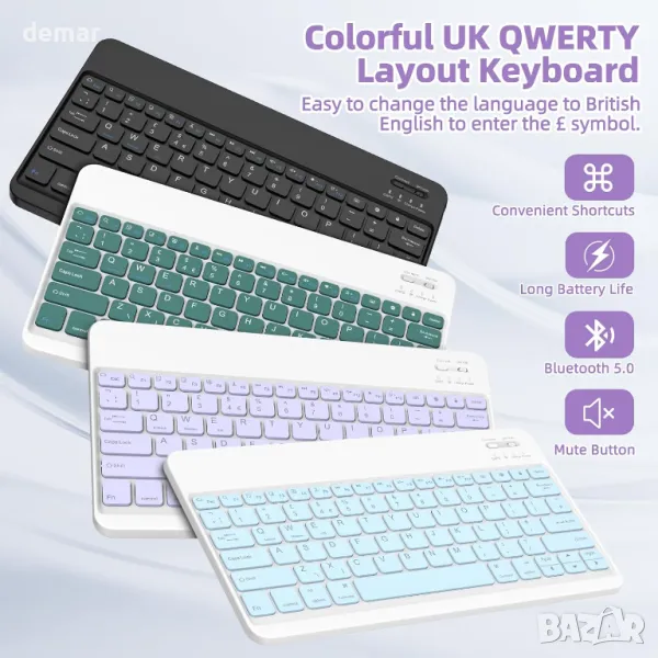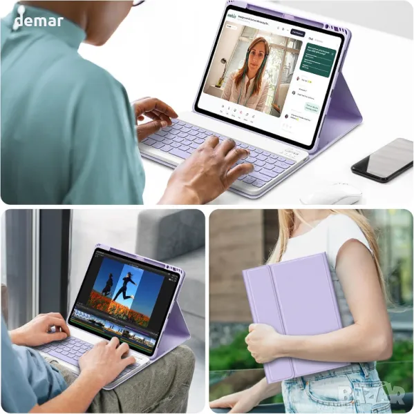 , включващ цветна UK QWERTY клавиатура, която се свързва чрез Bluetooth към множество устройства и поддържа британски Английски вход. Неговата подобрена нехлъзгаща се материя позволява регулируеми ъгли на гледане, докато мекият TPU заден капак предпазва от удари и надраскване, като подобрява разсейването на топлината. Функцията за автоматично заспиване/събуждане помага за запазване на живота на батерията, а прецизните изрези осигуряват лесен достъп до всички портове и функции. Освен това включва вграден държач за Apple Pencil, който гарантира, че можете да го държите под ръка по всяко време.