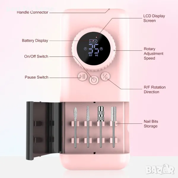 Интегриран органайзер за свредла: Нашата електрическа машина за бормашина за нокти разполага с вградено място за съхранение на свредла, поддържайки вашето работно пространство подредено и ефективно, като същевременно осигурява лесен достъп и организирано съхранение