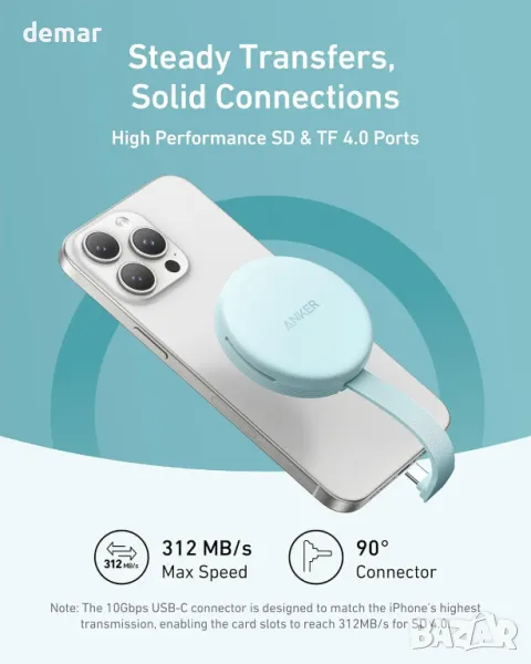 Този USB-C адаптер предлага безпроблемно видео заснемане и редактиране на смартфони, включващ ултра-надежден трансфер на данни с SD & TF 4.0 портове, поддържащи скорости до 312MB/s. Позволява едновременно синхронизиране на данни и зареждане с максимална мощност от 42,5 W, идеално за многозадачност. Проектиран за преносимост, адаптерът лесно се свързва към вашия USB-C iPhone след поставяне на SD и TF картата и може да бъде закрепен магнитно за стабилна употреба. В пакета са включени Anker MagGo USB-C адаптер (3-в-1, 10Gbps за iPhone), лист за безопасност и QR код за ръководството за потребителя.