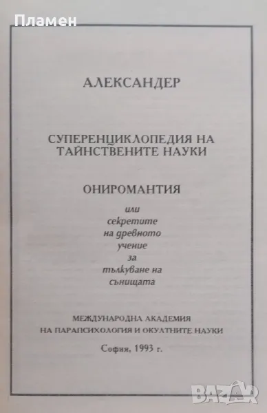 Александер - Суперенциклопедия на тайнствените науки. Том 8: Ониромантия, или секретите на древното учение за тълкуване на сънищата -издание 1993г. в 240 страници -20 лв.