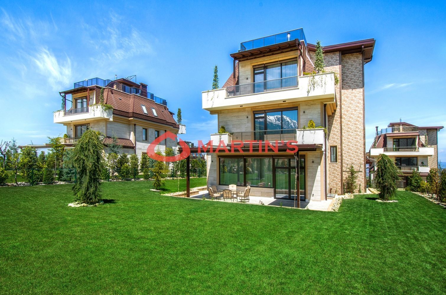 Живущите в комплекса се наслаждават на неповторима гледка към Витоша планина и цяла София от своите панорамни покривни тераси с площ от 62 кв.м. Напълно озеленените дворове на къщите варират между 715 кв.м. и 1400 кв.м. с изградени поливни системи, както всички озеленени общи части.