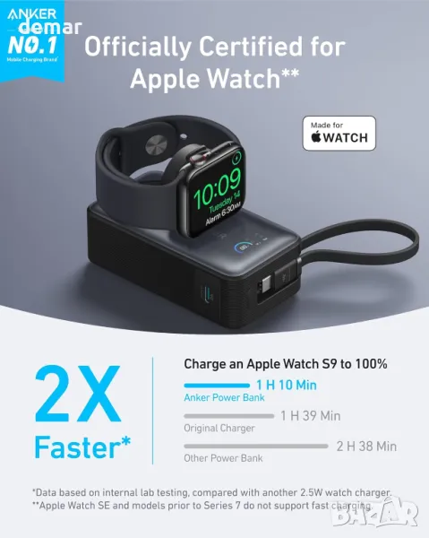 Anker MagGo Power Bank за Apple Watch, официално сертифициран 10 000 mAh с вграден USB-C кабел