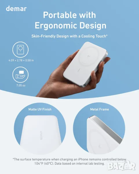 Тази захранваща банка съчетава максимална преносимост и мощност в тънък дизайн с размери 104 × 70,6 × 14,7 mm. Той разполага с ултрабързо 15W безжично зареждане, което може да зареди iPhone 15 Pro от 0 до 50% само за 41 минути, заедно с универсален 30W USB-C порт. Ергономичният дизайн включва матово UV покритие и издръжлива метална рамка, подсилена от термоизолация от аерогел за комфорт по време на употреба. С капацитет от 10 000 mAh, той осигурява 1,8 пълни зареждания за iPhone 15 Pro, което го прави идеален за ежедневна употреба и пътуване. Пакетът включва Anker MagGo Power Bank, 60 см USB-C към USB-C кабел и ръководство за добре дошли.