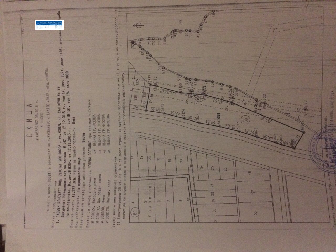 Парцел с площ от 41272кв.м номер на имот 056331, който се намира на брега на река Осъм с лице на реката над 500м. По границата на имота преминава електропровод на който е монтиран и трафопост от който може да се подаде ел. захранване в парцела. Имота е подходящ както и за селскостопанска дейност(оранжерии, ягоди малини и др. ) , така и за всякаква друга дейност за която са нужни ток и вода .Имота е подходящ и за изграждане на фотоволтаична централа или ВЕЦ с мощност от 1,5 - ДО 2,5 Мвата на час, поради преминаването на реката през него.Възможен е лизинг,бартер за друга земеделска земя, гори имоти и др. движимо и недвижимо имущество тел. за повече информация - 0898585834