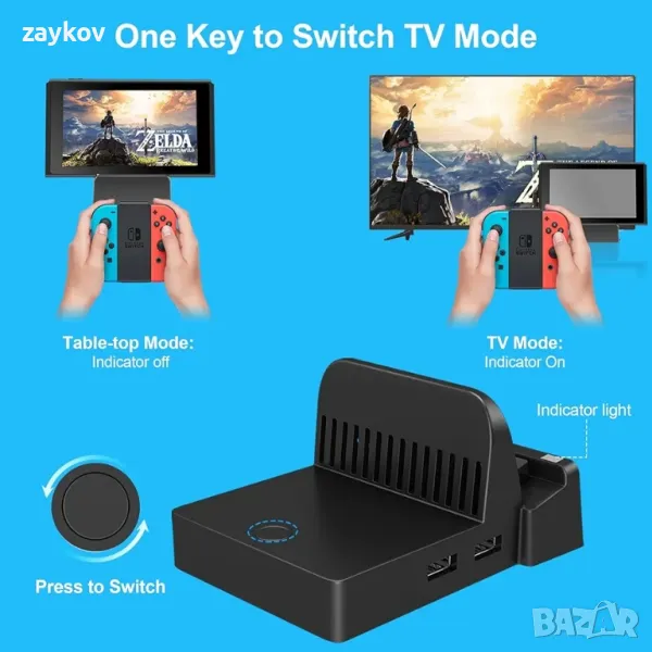 ТВ докинг станцията за Nintendo Switch поддържа 4K, 1080P и 720P видео изход (Nintendo Switch поддържа само 1080P), което прави екрана на играта по-ясен. Превключване на екрана на докинг станция за телевизор с едно докосване: Лесно превключване с едно докосване към режим на телевизор и маса