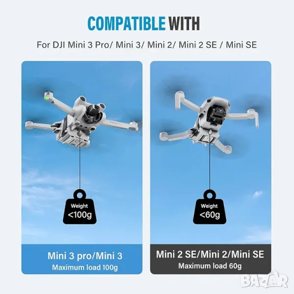 Максимално натоварване: натоварването на Mini 4k/Mini 4 pro/Mini 3/Mini 3 Pro е в рамките на 100 g; При използване се препоръчва да летите с ниска скорост и бавно да се спускате при спускане и да използвате N-предавка за освобождаване.