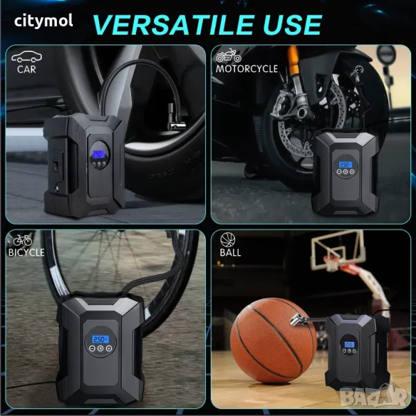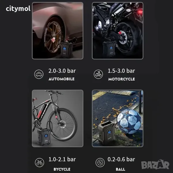 - Преносимият помпа за автомобилни гуми е оборудван с 3 дюзи и 1 допълнителен предпазител. Перфектна за помпане на автомобили, мотоциклети, велосипеди, топки и други надуваеми предмети,