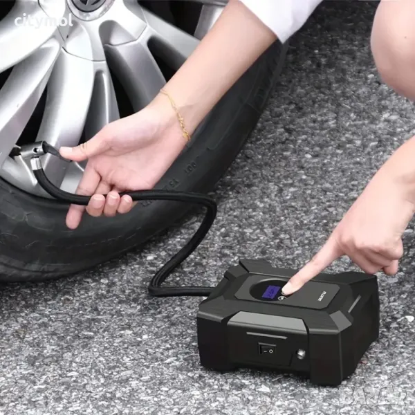 - Включете го в 12V електрически контакт на колата си и прикрепете маркуча към вентила на гумата и включете, той ще свърши цялата работа вместо вас.
