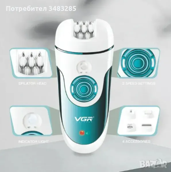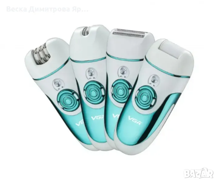 Тип продукт : Епилатор;Епилатор 4в1 VGR V-700 е многофункционално устройство, предназначено за ефективна грижа за кожата. Той предлага 4 различни приставки, които позволяват епилация, бръснене, почистване на лице и масаж. Подходящ е за употреба на различни части от тялото, включително крака, ръце, подмишници и лице;Основни характеристики:Модел: VGR V-700;Функции: Епилация, бръснене, почистване на лице, масаж;Тип захранване: Безжично, с вградена акумулаторна батерия;Време за зареждане: 2 часа;Време за работа: до 90 минути;Водоустойчивост: Подходящ за суха и мокра употреба;Приставки: 4 сменяеми глави;Лесно почистване: Главите са сваляеми и се мият под вода;Гаранция 12 месеца.