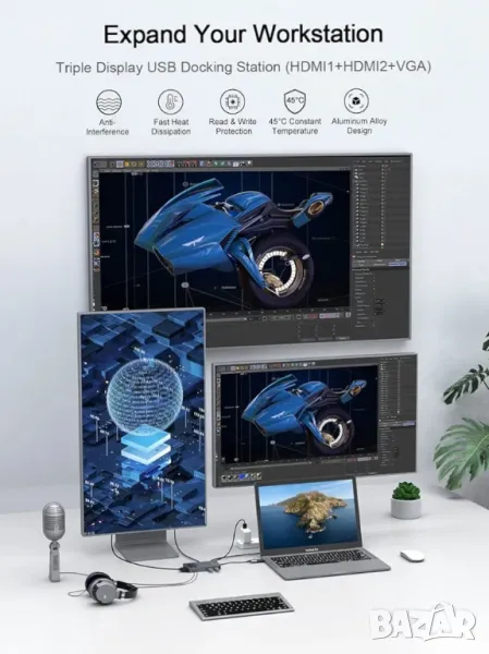 Двоен HDMI и VGA видео изход: Съвместим с докинг станции с двоен или три екрана, разширете или огледайте екрана на вашия лаптоп с HDMI или VGA порт и предавайте Full HD 2K видео директно към 3 монитора, проектора или HDTV. Докинг станцията с вградени 3,5 mm жакове за слушалки и микрофон предлага 3D ефект, ярко видео и ясна аудио синхронизация.