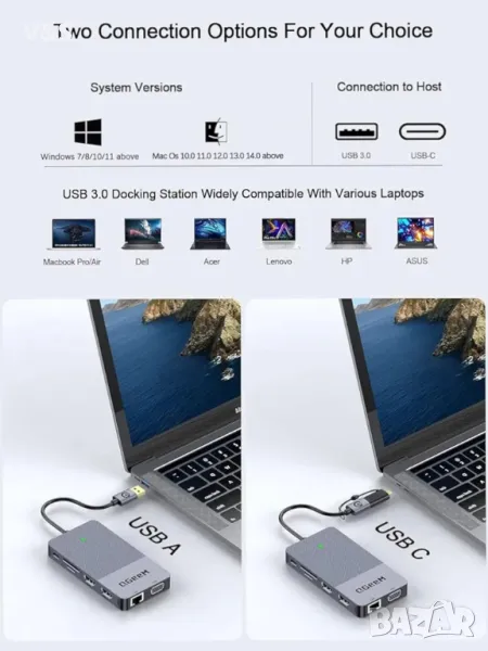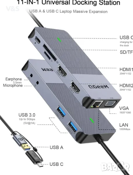 ДОКИНГ СТАНЦИЯ 11-В-1 USB 3.0 HDMI ETHERNET ВРЪЗКИ