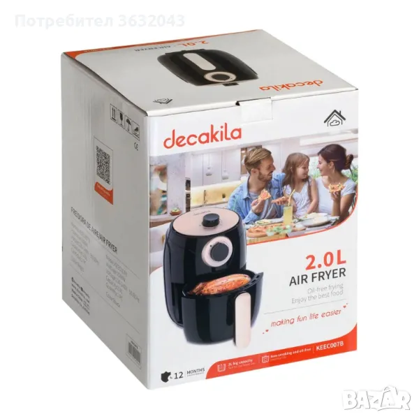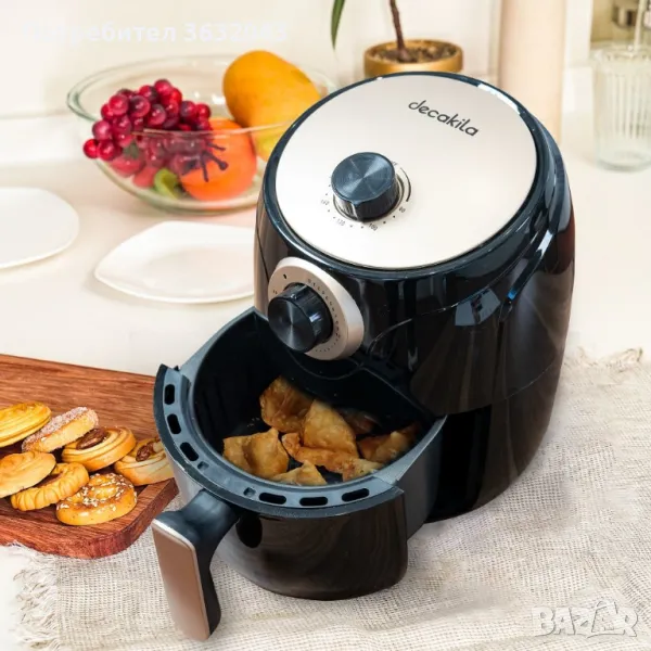 Фритюрник DECAKILA Air Fryer е здравословния начин да приготвите бързо всичките си любими храни с малко или никаквa мазнина. Лесен и удобен за използване с 30-минутен таймер и автоматично изключване. Мощност 1000 W и капацитет от 2 литра, с подвижна кошница за готвене с незалепващо покритие, което прави храната лесна за сервиране, а уредът лесен за почистване. Фритюрникът може да се нагрее до 200° и използва метод на циркулация на топлина, за да приготви храната ви невероятно бързо. Идеален за домашно приготвен чипс, пържено пиле, лучени кръгчета и печени зеленчуци. Подходящ е за приготвяне на пържени картофи, месо и риба.