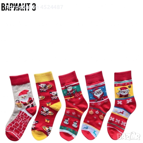 Тип продукт : Коледни чорапи,дамски;Дамски чорапи с коледни мотиви – перфектният аксесоар за празничния сезон! Комплектът включва 5 чифта в размер 36-40. Изработени от висококачествени материали: 78% памук, 19% полиестер и 3% еластан, те осигуряват комфорт и мекота през целия ден. Чудесен избор за уют и настроение през зимните дни!Предлагат се в 5 варианта : Вариант 1 - Червено-сива гама,коледни мотиви ;Вариант 2 - Снежен човек и пингвини;Вариант 3 - Червено-жълта гама ;Вариант 4 - Едри шарки, коледни мотиви ;Вариант 5 - Дядо Коледа-червена гама .