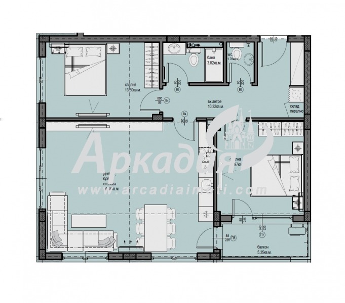 Жилището се състои от просторна дневна с кухненски бокс, две големи спални, баня с тоалетна,тоалетна,коридор и тераса. Предлага се завършен на шпакловка и замазка, цялостно вътрешно окабеляване за интернет и телевизия, входна блиндирана врата, дограмата е с немски профил.