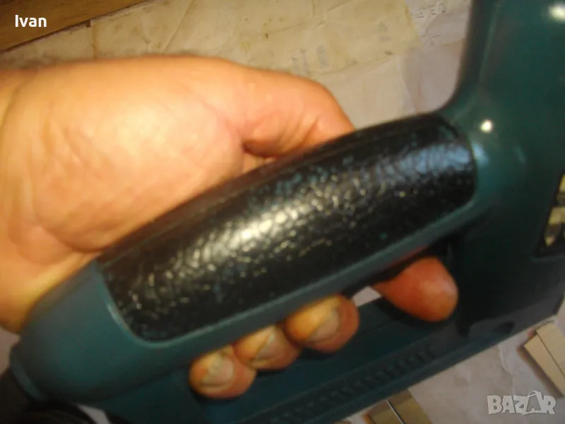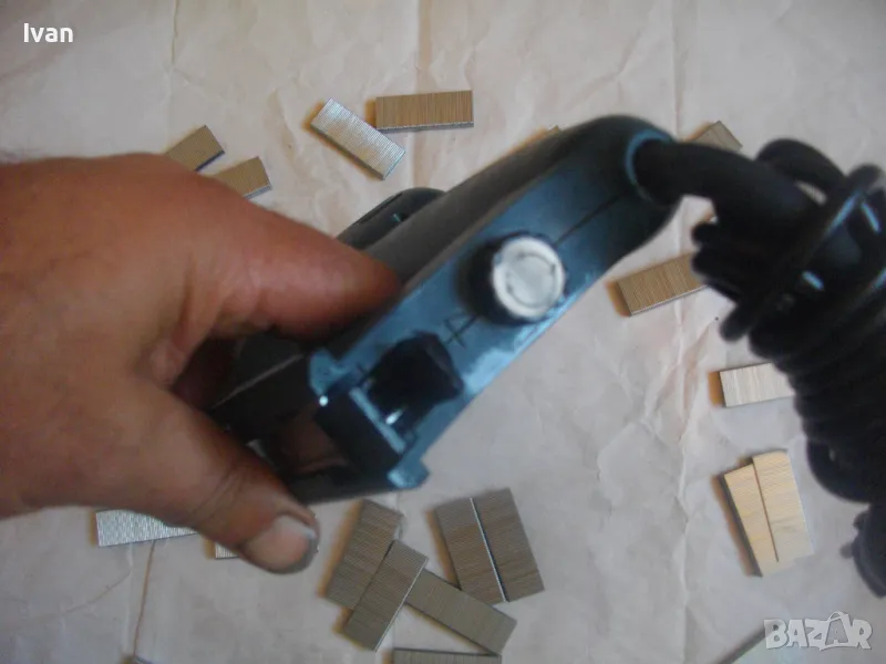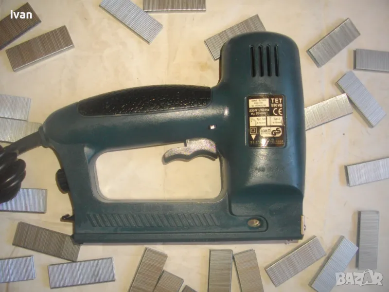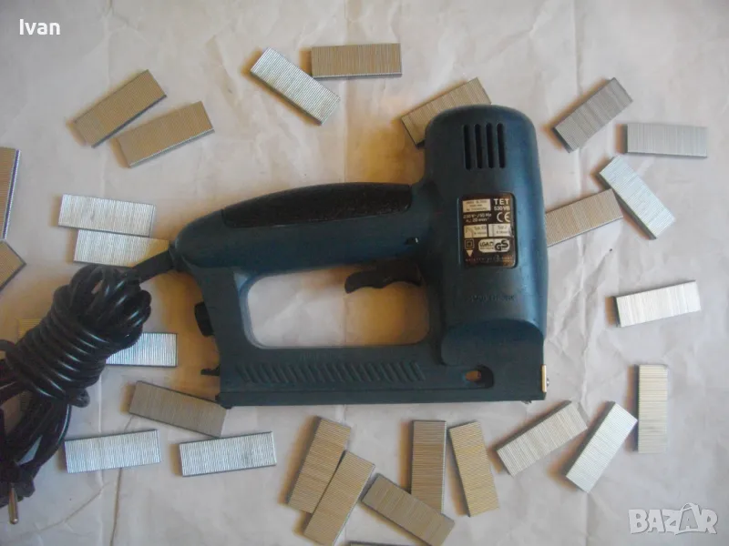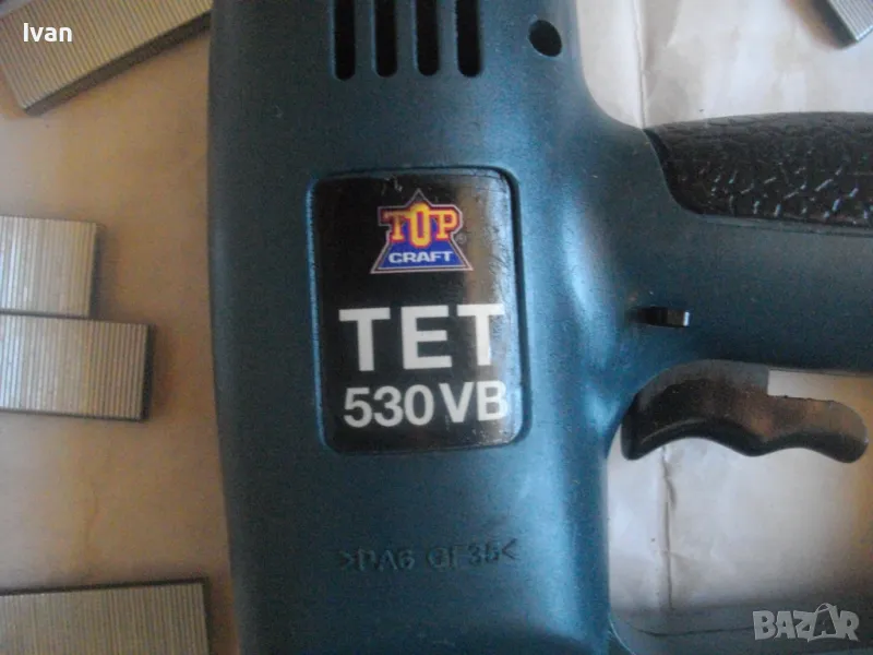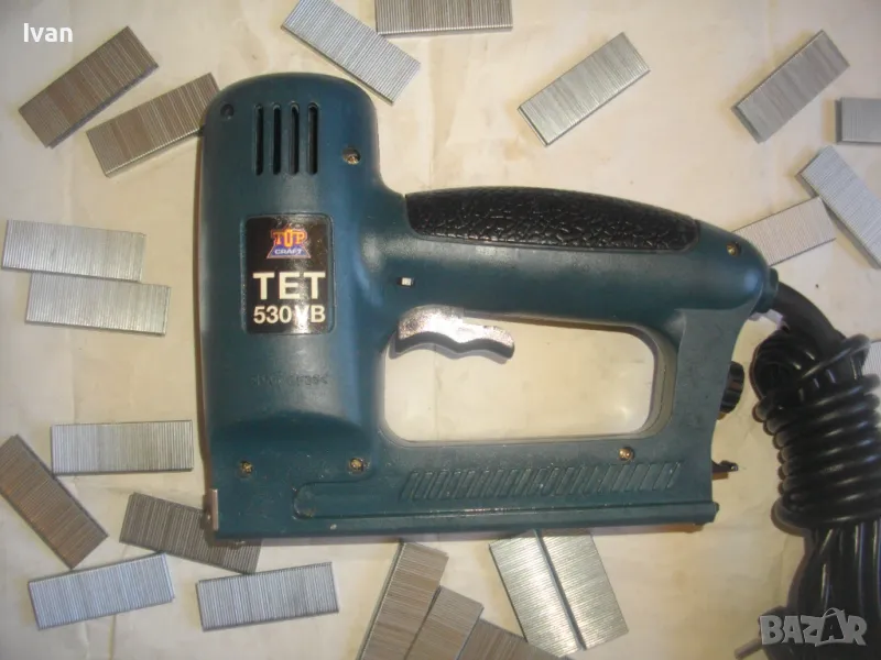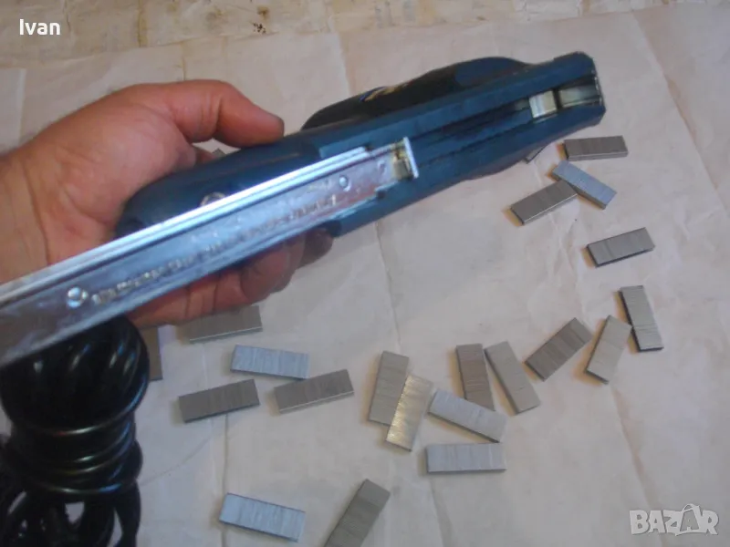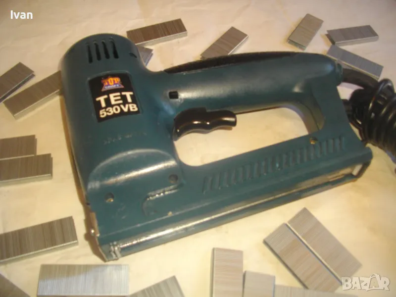 ектрически дърводелски тапицерски такер тъмносин Top Craft TET 530VB - цена 59 лв. Със забележка - за части - за ремонт - липсва удар. Не е правен опит за отстраняване на механичния проблем. Предполагам трябва да се отвори и да се наместят частите на буталото. Производство на машината 2003 г . оригинално маркирано немско Germany. За скоби тип 53 универсални 8-14 мм и пирони тип J размер 8-16 мм. Регулация на удар, заключване на спусъка. Заредени скоби в пълнителя.