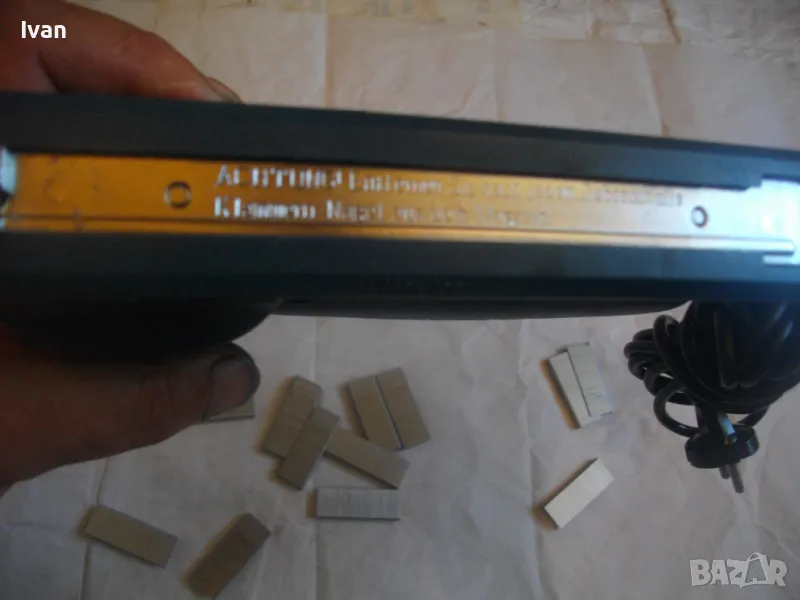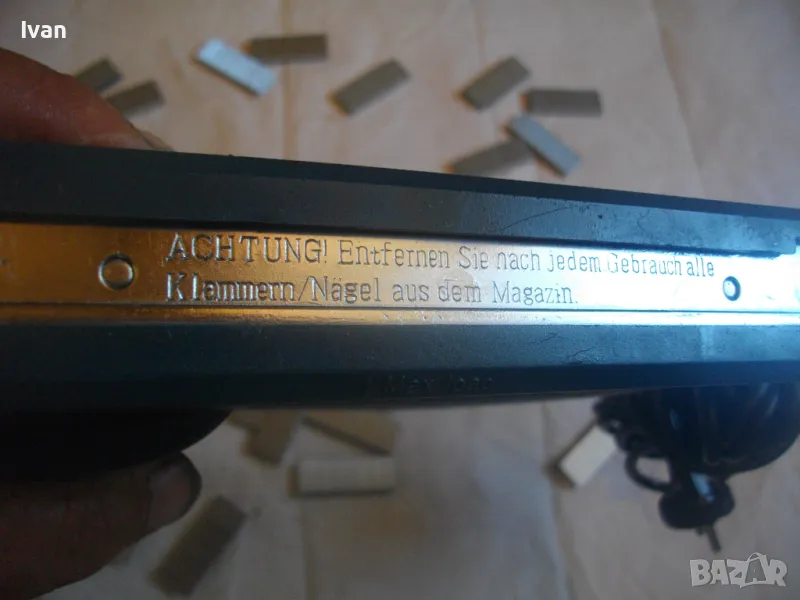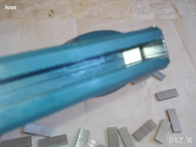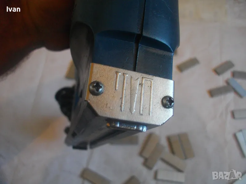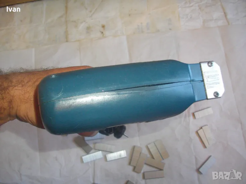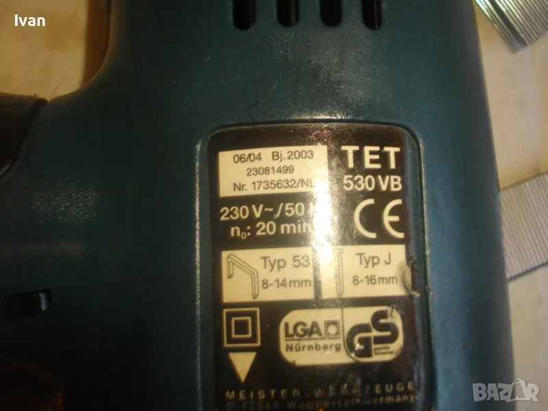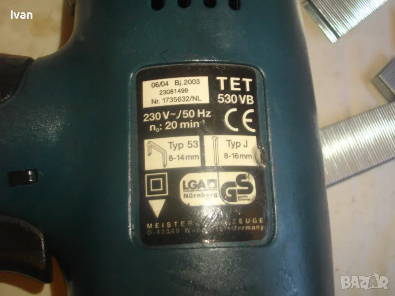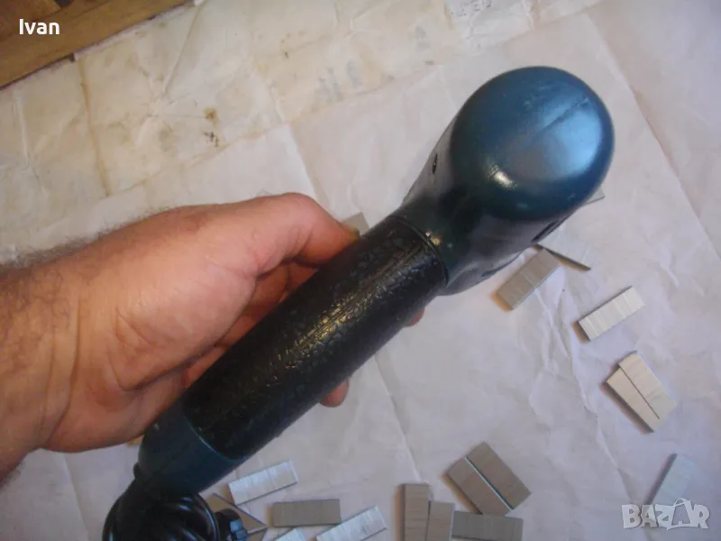 ектрически дърводелски тапицерски такер тъмносин Top Craft TET 530VB - цена 59 лв. Със забележка - за части - за ремонт - липсва удар. Не е правен опит за отстраняване на механичния проблем. Предполагам трябва да се отвори и да се наместят частите на буталото. Производство на машината 2003 г . оригинално маркирано немско Germany. За скоби тип 53 универсални 8-14 мм и пирони тип J размер 8-16 мм. Регулация на удар, заключване на спусъка. Заредени скоби в пълнителя.