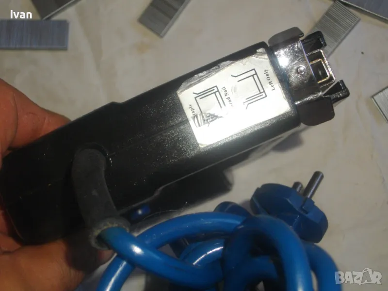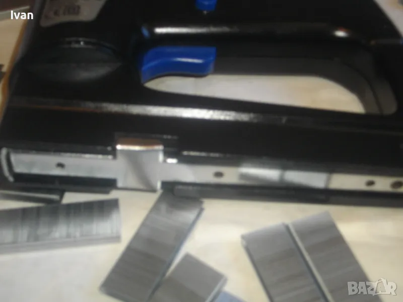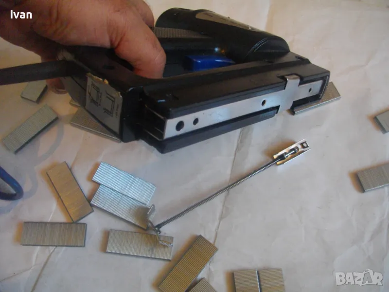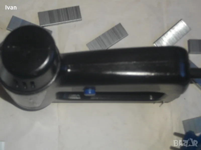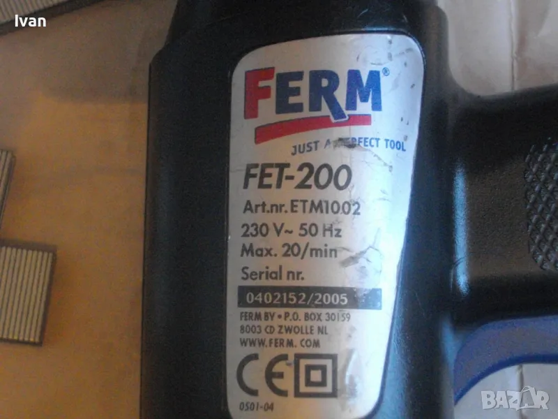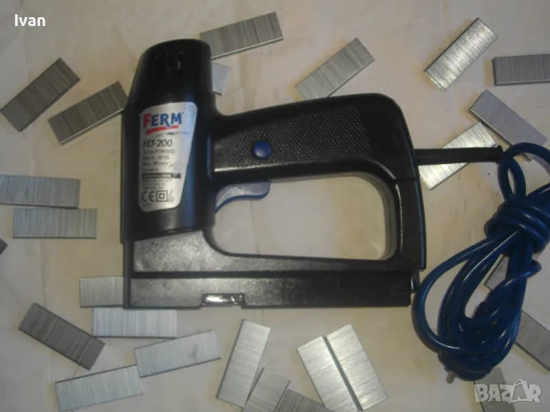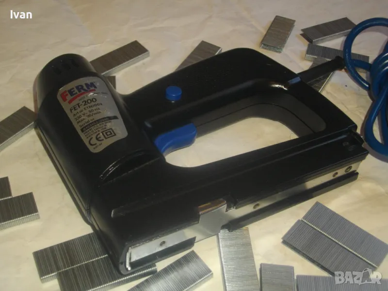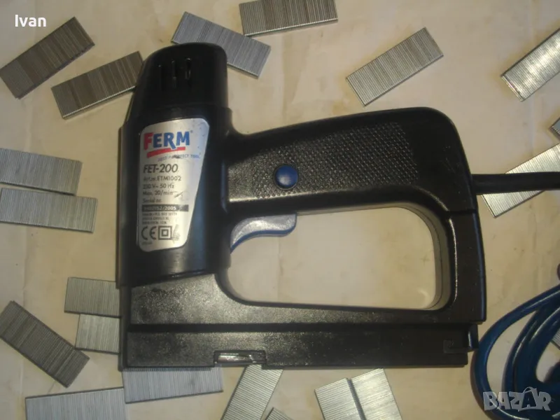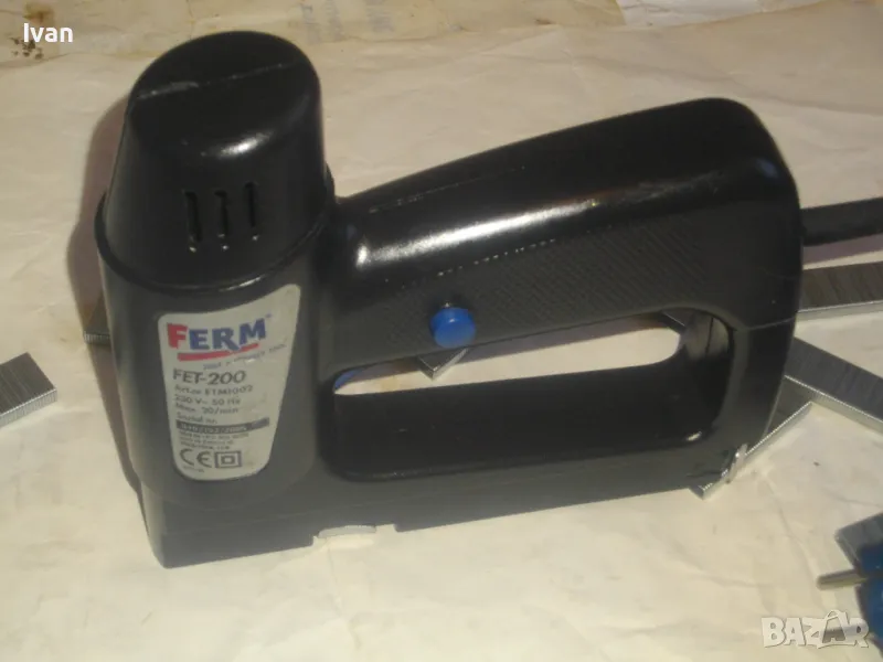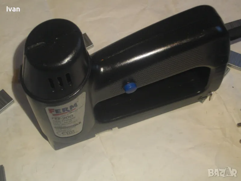 Електрически дърводелски такер малък нидерландски холандси черен FERM FET-200 - цена 129 лв. Вписано и маркирано оригинално производство на концерна FERM и страна производител Нидерландия - NL. За консумативи скоби размери 6-14 мм, игли пирони без глава 14 мм и пирони с глава размер 14 мм. Автозащита на спусъка. Много запазен външен вид и ОТЛИЧНО работно и механично състояние на машината. Заредени скоби или пирони в пълнителя за проба и тест.