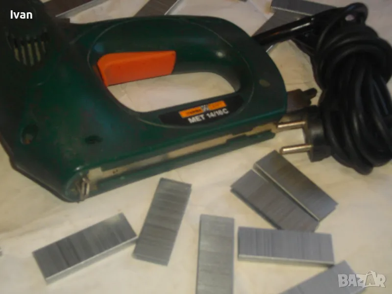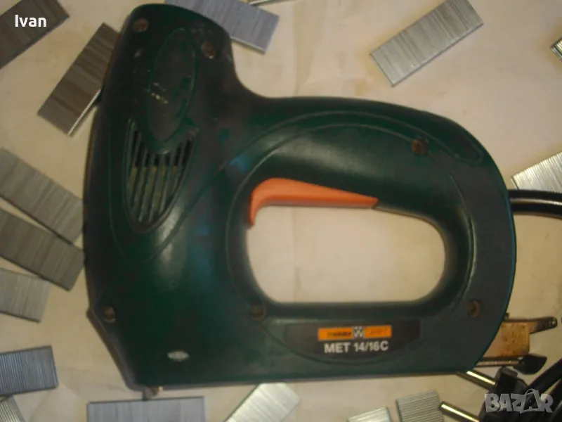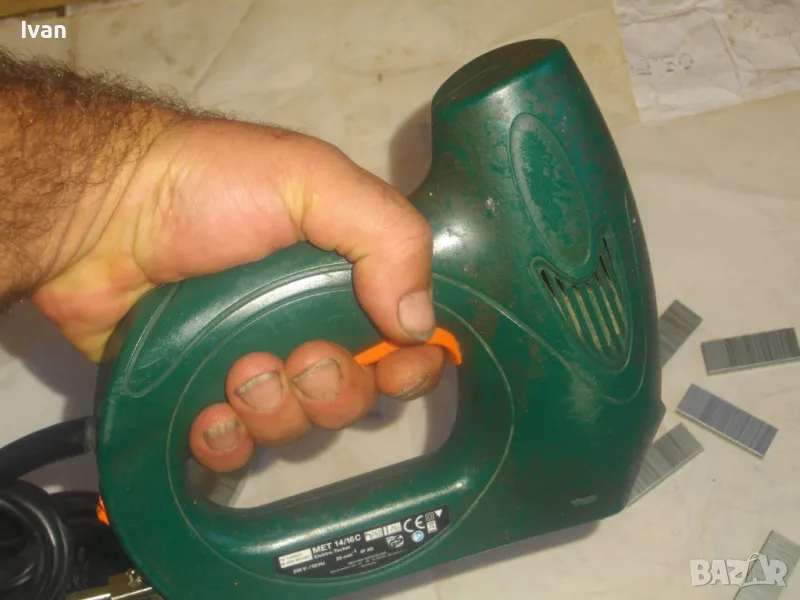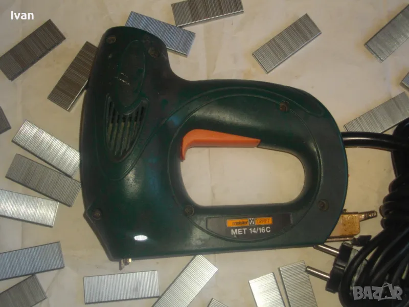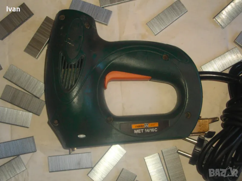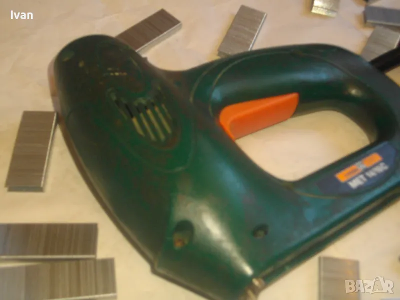 Електрически дърводелски тапицерски такер зелен Meister Craft MET 14/16C - цена 129 лв. Оригинално немско маркирано производство 2008 г. Germany. Запазен външен вид и ОТЛИЧНО работно техническо механично състояние. За консумативи скоби тип 53 размер 8-16 мм и пирони тип J размер 10-16 мм.