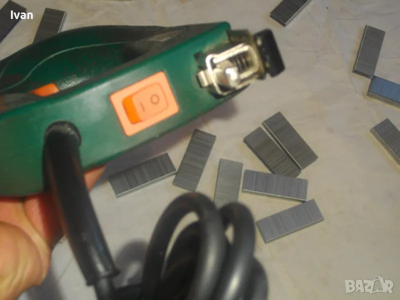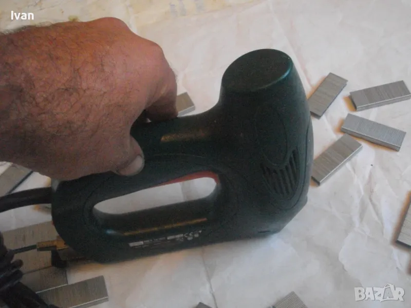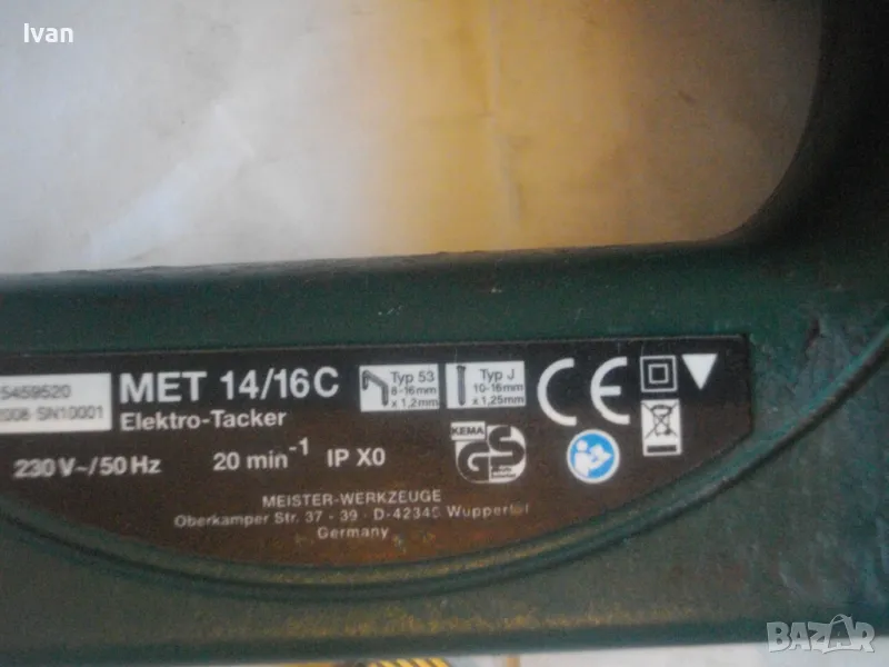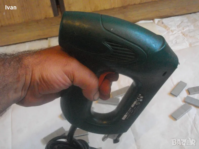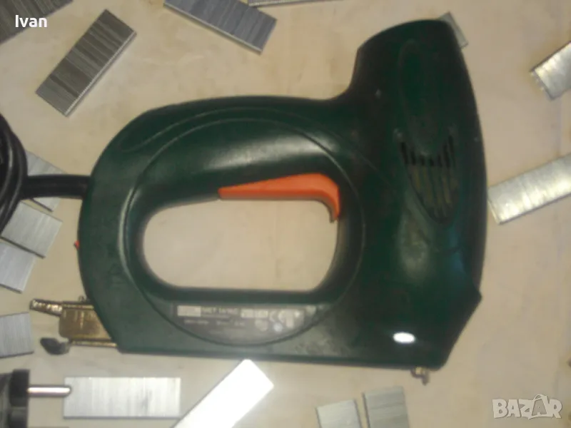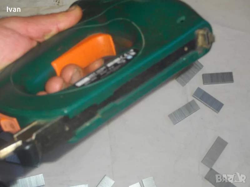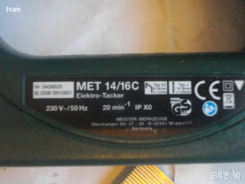 Електрически дърводелски тапицерски такер зелен Meister Craft MET 14/16C - цена 129 лв. Оригинално немско маркирано производство 2008 г. Germany. Запазен външен вид и ОТЛИЧНО работно техническо механично състояние. За консумативи скоби тип 53 размер 8-16 мм и пирони тип J размер 10-16 мм.