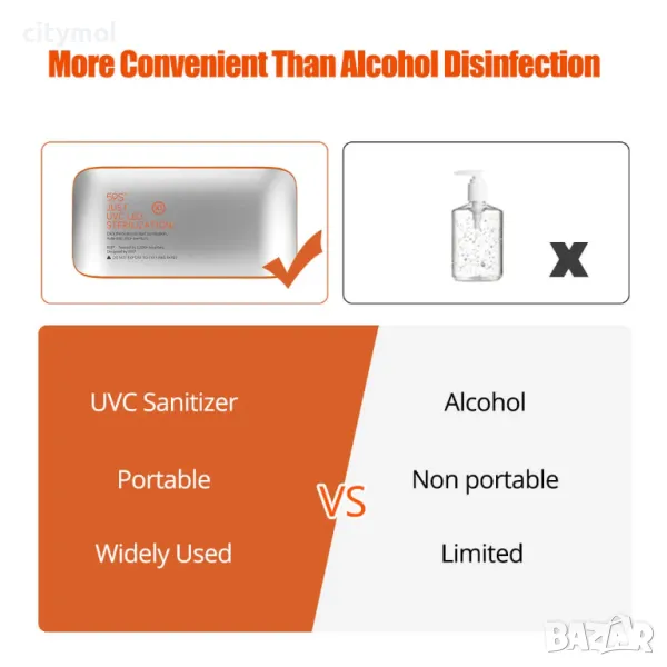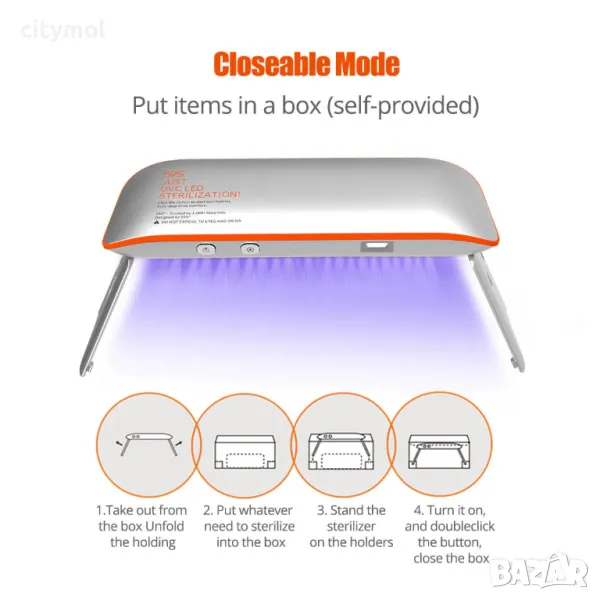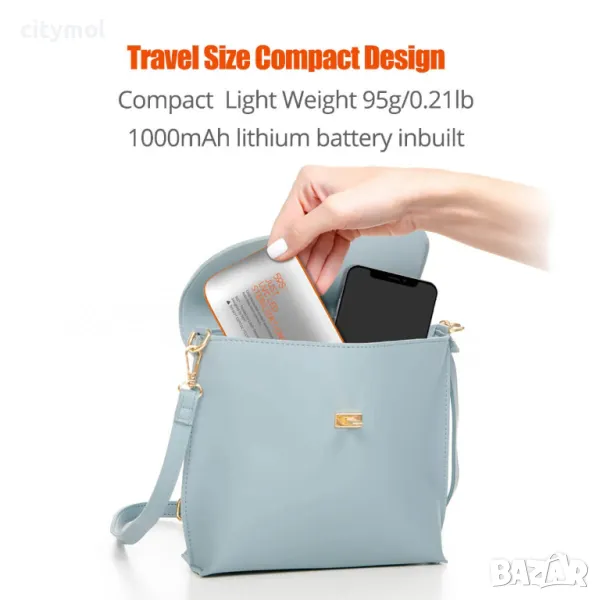 стерилизатор, с вградена зарядна батерия. Може да се пренася лесно в чанта, раница или сак и работи с натискане на един бутон.