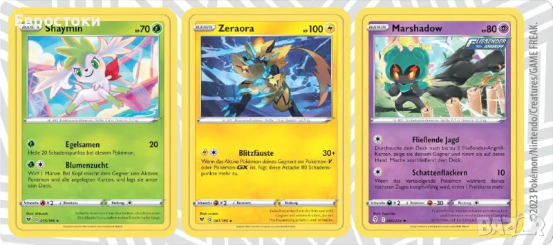 Включва 1 холографска карта с Shaymin, 1 холографска карта със Zeraora и 1 холографска карта с Marshadow