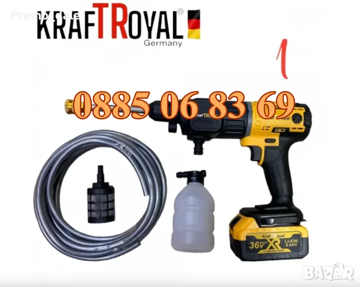 5в1 универсален комплект с 5 приставки, сменяеми глави KRAFTROYAL 36V: водоструйка, винтоверт, гайковерт-импакт, перфоратор и ъглошлайф – акумулаторен инструмент с 2 батерии