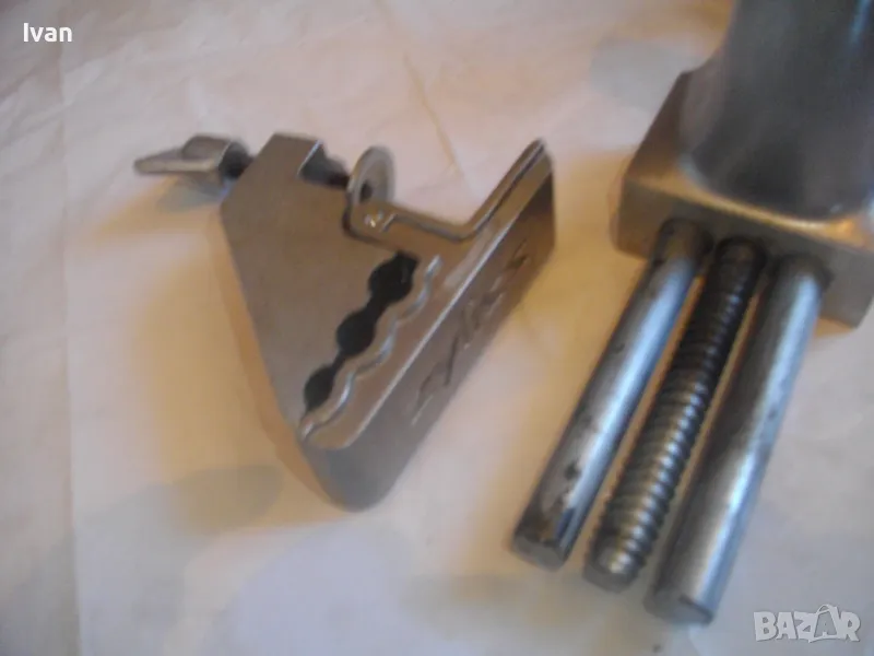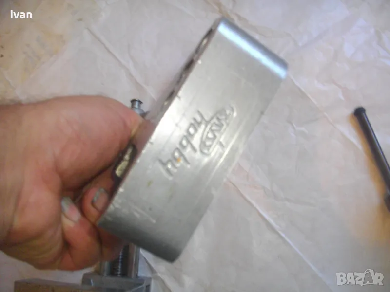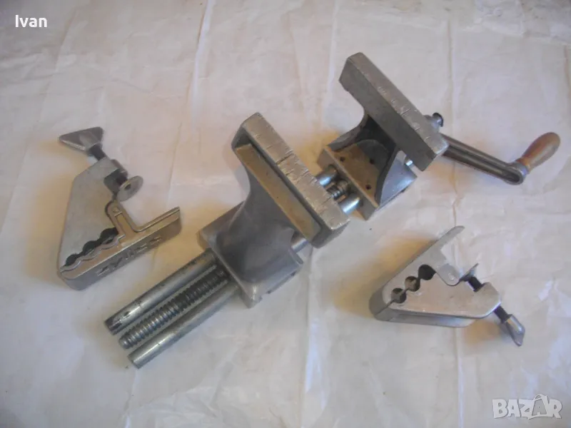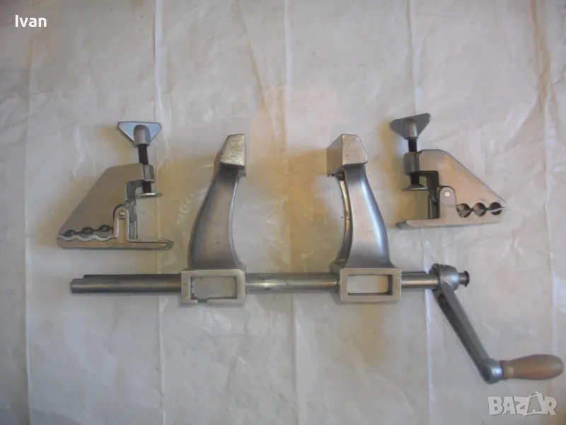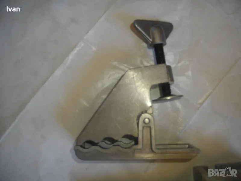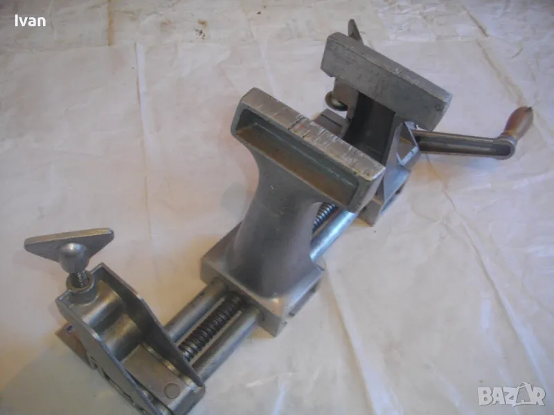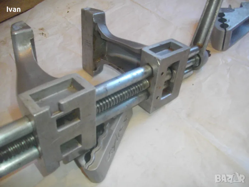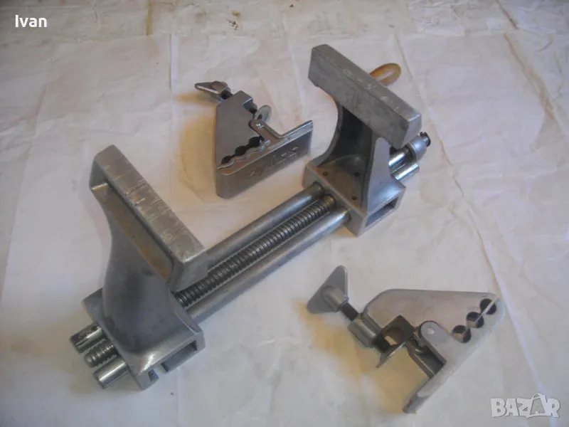 Алуминиево дърводелско швейцарско менгеме с 2 щипки - 149 евро/ цена 291,42 лв Почти ново, масивно, голямо менгеме, изцяло от алуминий, еднокомпонентно, професионален швейцарски модел с много голям захват от пълна 0 до 21,6 см без щипките, а с поставени щипки захват - 16 см.