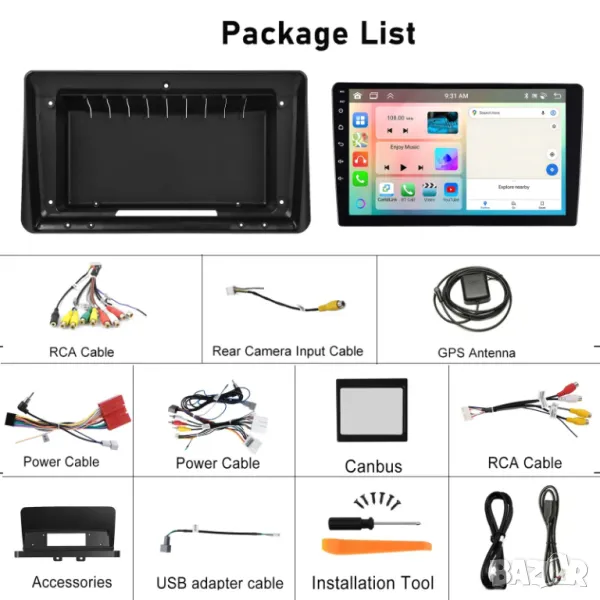 Пълен комплект с цялата рамка, преходни кабели и букси, декодери, предназначени и съвместими за монтиране на конкретния модел автомобил.