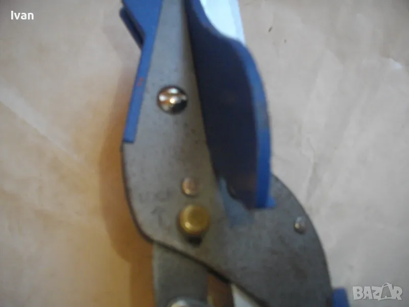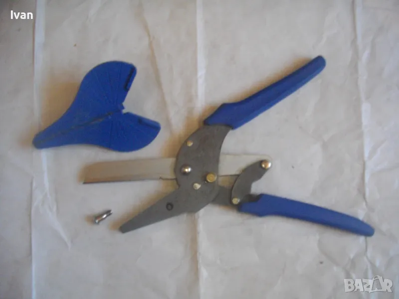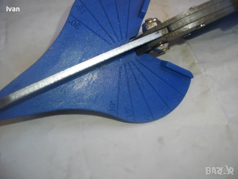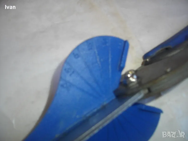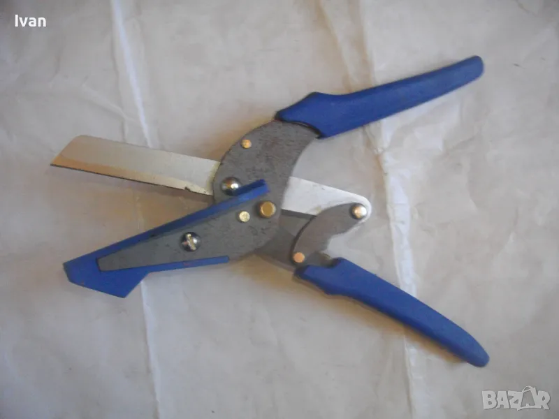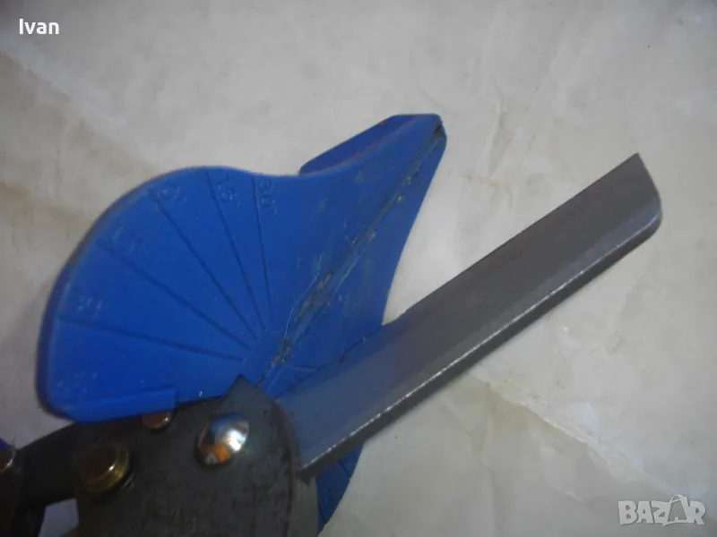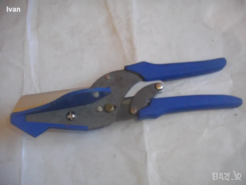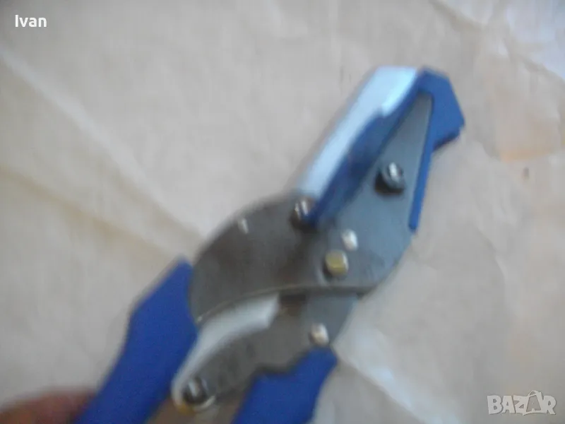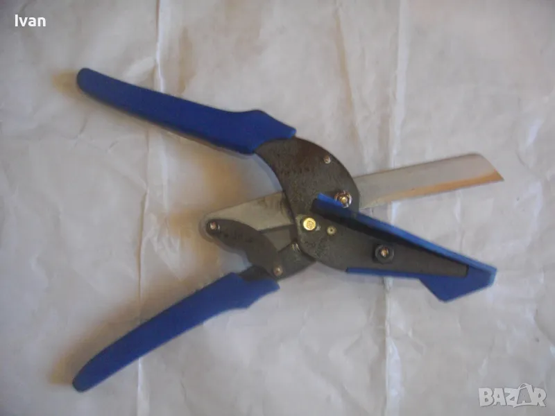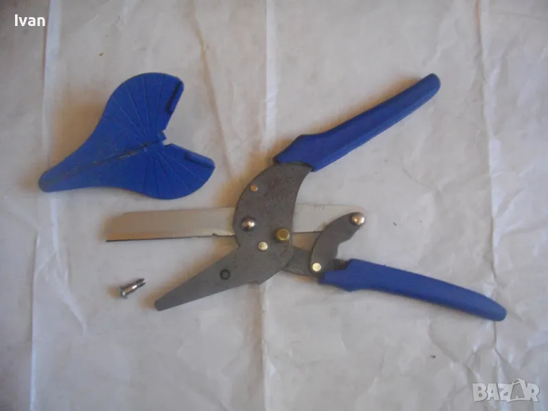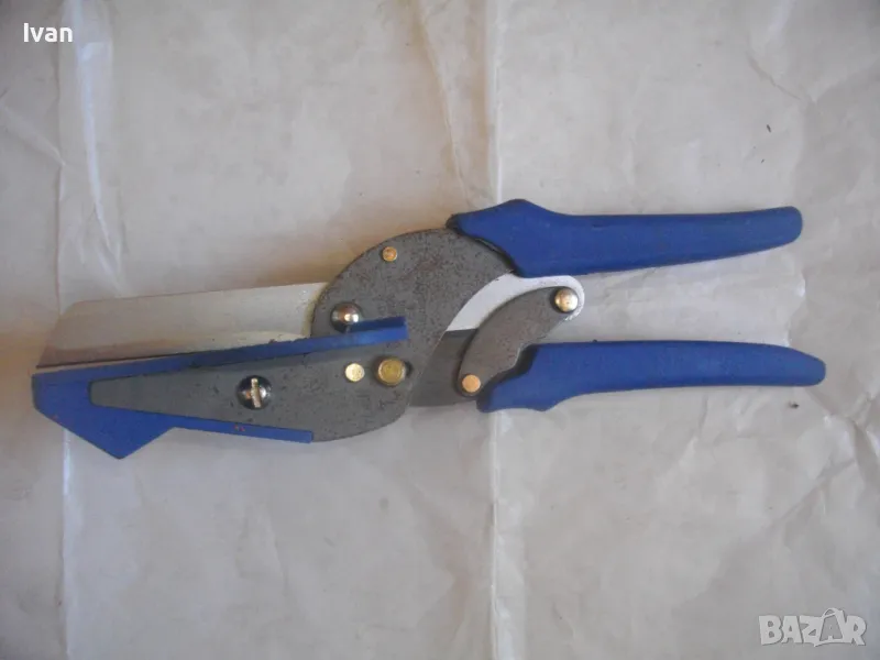Ножица за променливо ъглово рязане на пластмасови тръби и ПВЦ профили 0-45 градуса - цена 129 лв. Немска, отлично състояние. Почти нова. Заключване на острието. Острие нож - отлично, с дължина 82 мм. Сменяем нож и възможност за сменяне на приставката за ъглово рязане с друга различна. Удобни гумирани покрития вложки на дръжките. Цялостна дължина на ножицата за променливо рязане под ъгъл 0-45 градуса - 250 мм. Цена 129 лв.