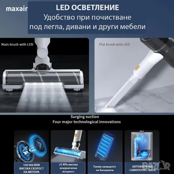 засмукване, LED осветление, 60 минути максимално време на работа на