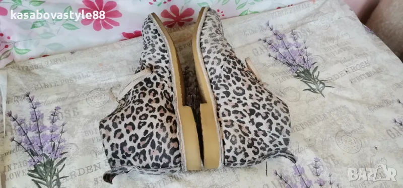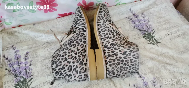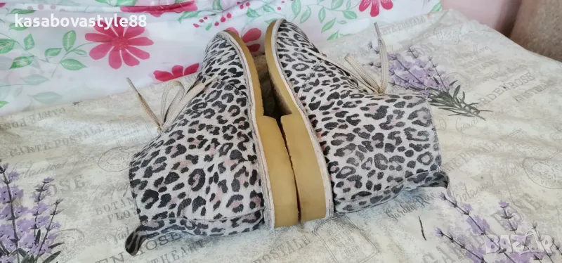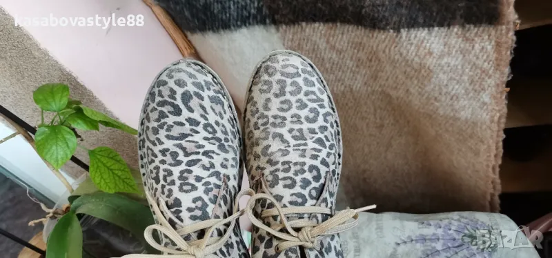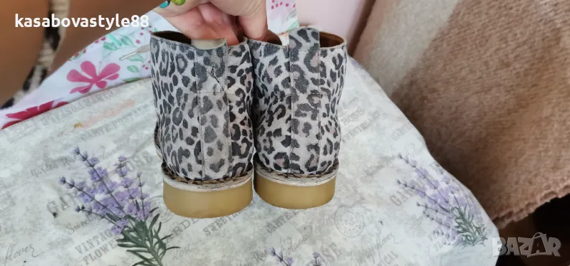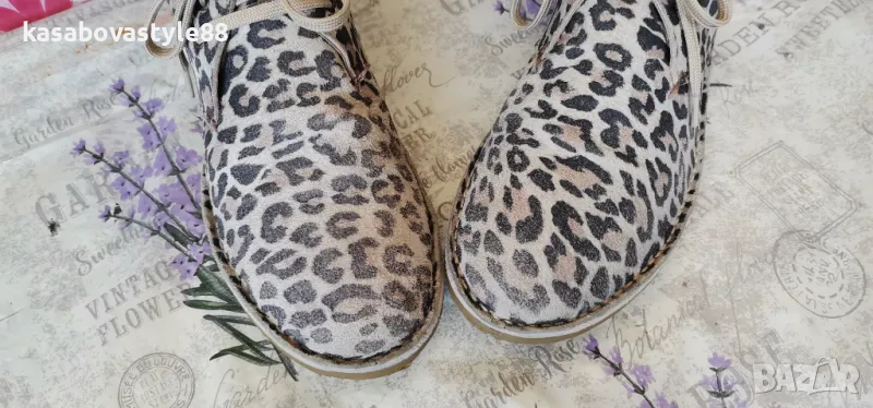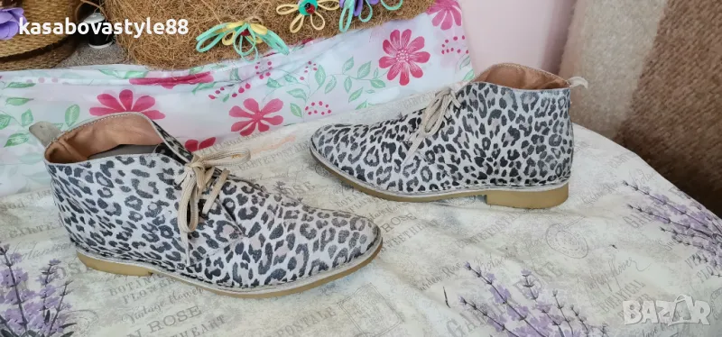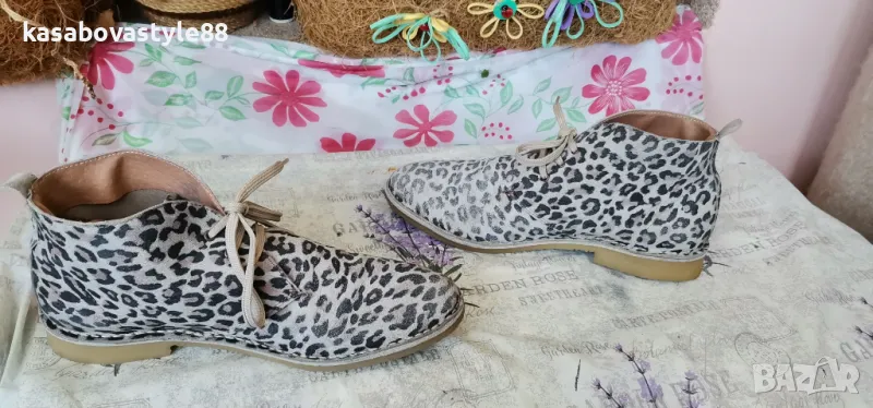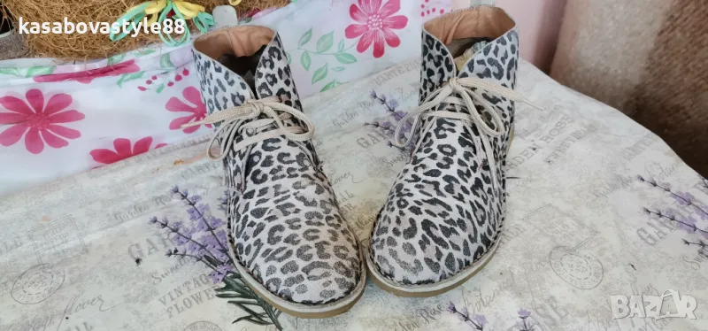 Актуален модел дамски боти за сезон пролет-есен. Изработени от естествена кожа с ефектнa тигрова шарка. Те са с леко и еластично ходило на ток с височина 2.5см.Обуват се с помощта на връвки. Моделът е умален и отговарят на 40 н. Дължина на стелка 26см.Цялсотна височина отзад 12см.