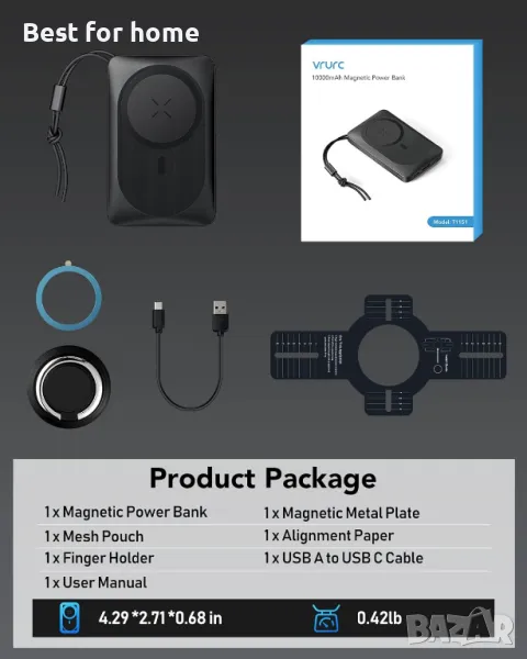 Безжично преносимо зарядно устройство VRURC за iPhone, 10000 mAh Magnetic Power Bank, PD 20 W бързо зареждане USB C батерия с държач за пръсти за iPhone 15/14/13/12 Pro/Pro Max/Plus/Mini, черен