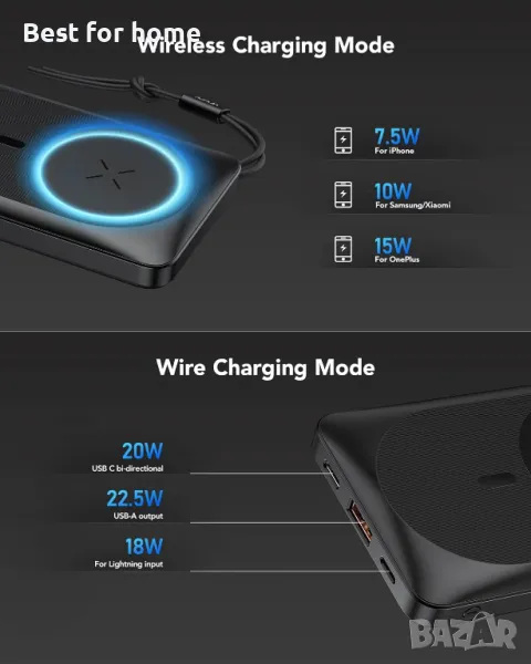 Кабелно зареждане 22,5 W USB A изход, предназначен за Samsung/LG/Google android Series; 20W USB C вход и изход; 18W Lightning Input