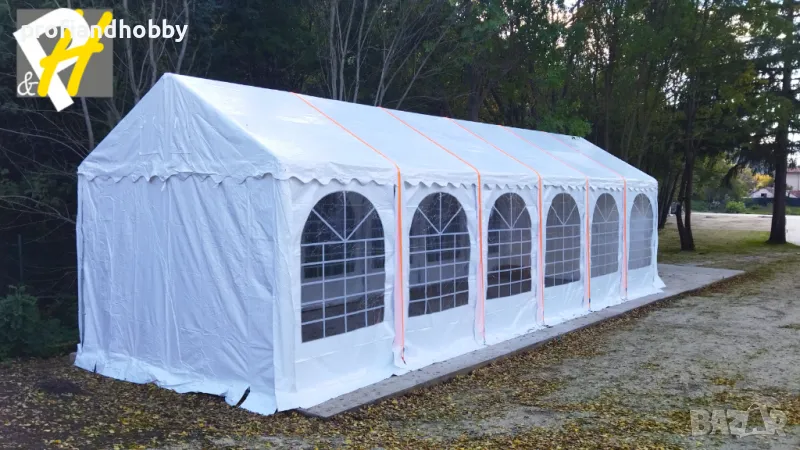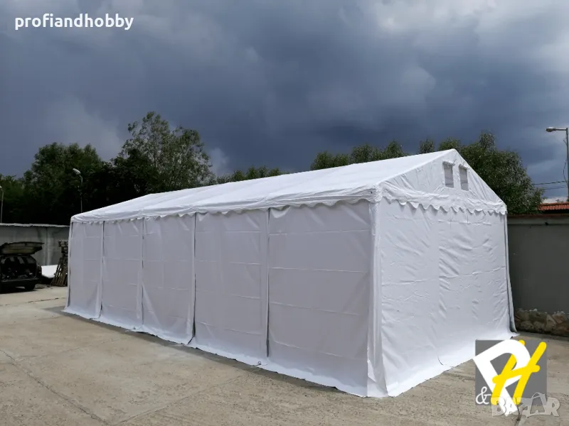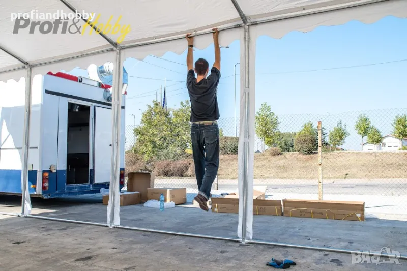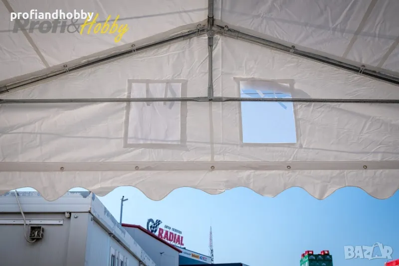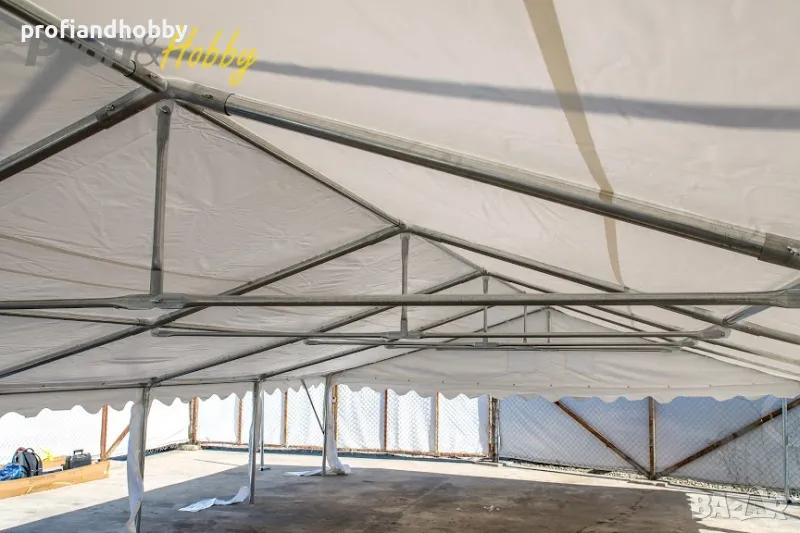 ази шатра разполага със стабилна конструкция от поцинкована стомана с антикорозионна защита и подсилен огнеустойчив PVC брезент с тегло 550 г/м2. По-здравият покривен материал осигурява висока слънцезащита UV 80+, издържа на силен вятър и е 100% водоустойчив.