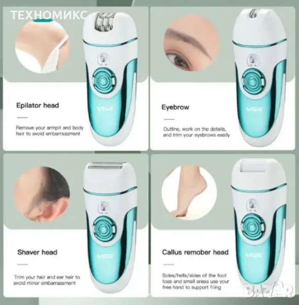 Епилатор 4в1 VGR V-700 е многофункционално устройство, предназначено за ефективна грижа за кожата. Той предлага 4 различни приставки, които позволяват епилация, бръснене, почистване на лице и масаж. Подходящ е за употреба на различни части от тялото, включително крака, ръце, подмишници и лице;