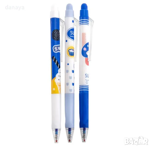 Изтриващ се син химикал с гума с принт. Клик модел. Изтриваем химикал, пишещ със синьо мастило. Изтрива се много лесно и бързо и не оставя следи. Особено подходящ за деца от началните класове. Този симпатичен химикал, детето ще може да изтрие лесно грешно написаното, без да оставя драсканици по листа хартия.