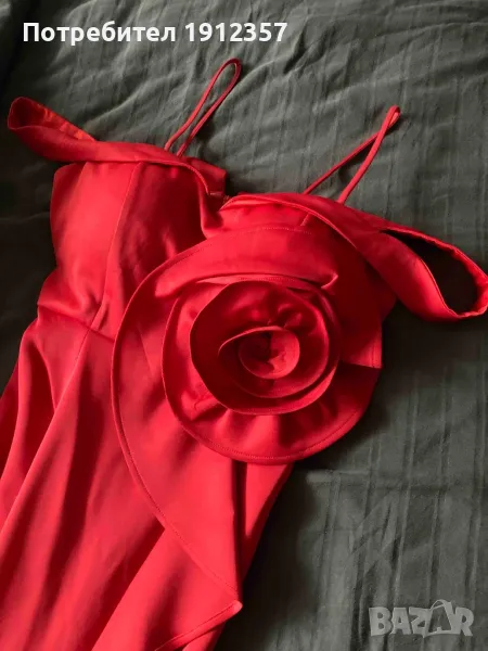 в червен цвят. Моделът е тип русалка, с паднал ръкав, вградени подплънки.
