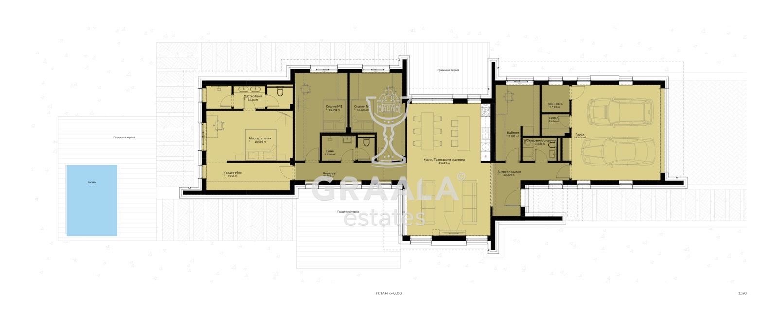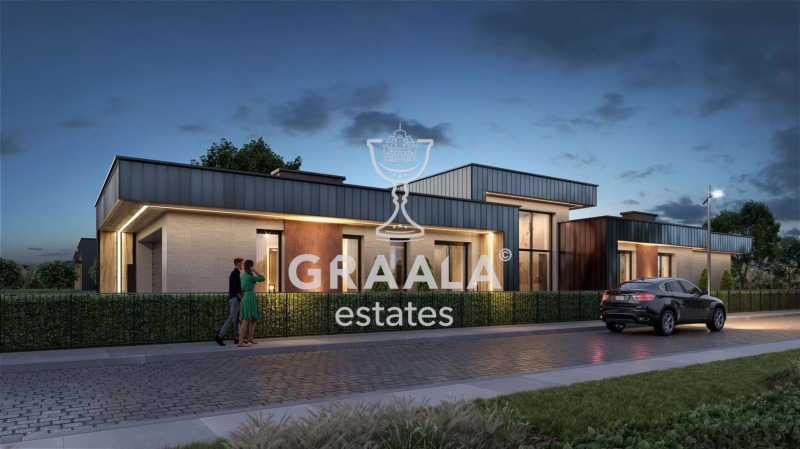 ГРААЛА ЕСТЕЙТС официален представител на инвеститора, представя уникален комплекс от къщи, находящ се в с.Гурмазово, в близост до град Божурище и отстоящо на около 13км. от столицата. През последните години районът се разви много като се превърна в изключително приятен за живеене страхотен въздух, сред природата между три планини - Люлин, Стара планина и Витоша. Климатът е сходен на този в град Банкя. Гурмазово същевременно придоби съвременен облик предвид многото новопостроени къщи, както и продължаването на строителството на такива. Конкретният имот представлява едноетажна къща със застроена площ 230кв.м., разпределена, както следва: Входно антре, коридор, водещ до просторна и разчупена кухня с трапезария и дневна, от която се излиза към градината. От дневната посредством друг коридор се отива до мастър спалня с мастър баня, две спални с обща баня-тоалетна. Също така от входното антре се отива към кабинет, тоалетна/мокро помещение, склад и техническо помещение. Към имота има и двоен гараж с топла връзка към къщата, както и две паркоместа пред гаража. Предимство на имота е самостоятелното дворното място, състоящо се от 700кв.м.Не пропускайте възможността да се съчетаете с природата!