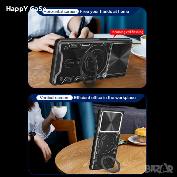 4. Голям метален пръстен отзад на гърба. Служи като стойка на която телефона може да се обляга в хоризонтално и вертикално положение. Също пръстена може да се използва и като finger holder за сигурно захващане на телефона с един пръст. За по-голямо удобство, пръстена може да се завърта на 360 градуса.