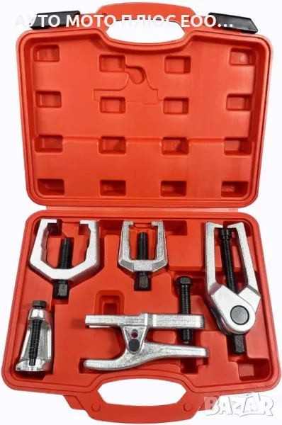 Удобен и практичен комплект за демонтаж и монтаж на шарнири, накрайници, втулки и лагери. Той ще улесни свалянето на частите и ще скъси времето за ремонт. Комплектът е подходящ за всички видове автомобили, предлага се в удобен пластмасов куфар за съхранение и пренасяне. Инструментите са изработени от стомана, което ги прави изключително издръжливи и устойчиви на корозия. Комплектът намира широко приложение и се използва предимно в авто сервизи, авто работилници и домашни работилници.