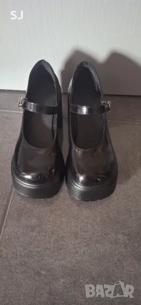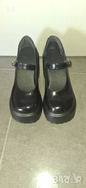Дамски черни обувки с дебел ток и платформа, Лак, подходящи за сезон пролет/есен. Отлично състояние.